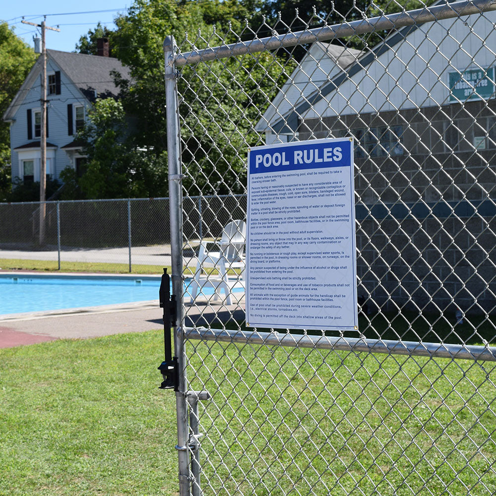 This swimming pool and facility pool sign is designed for harsh swimming pool and outdoor environments. It includes a brass grommet in each corner for easy hanging or mounting. This sign is printed using our high-quality weather and sun resistant inks.