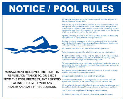 This is our general Pool Rules sign with an added management statement and in a larger size. It can be used by several states and is designed in accordance with ANSI pool rules. This sign meets the state codes for: AL, LA, MD, MS, NM, ND, PA, TN, TX, VT and VA. Our compliance signs are guaranteed to meet code within 90 days of purchase.