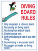 Diving Board Rules are recommended by the manufacturers for the diving boards. This sign is directed toward children and teens to encourage them to read the rules. These rules help prevent injuries and provide general guidelines for usage.