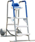 This is the Griff 4 foot All Terrain Guard Station that was developed using Tom Griffith's Five Minute Scanning Strategy for lifeguards. The elevated platform offers lifeguards increased visibility and the dual access steps allow for a shift change without interrupting water coverage. The All Terrain Guard Stations were developed for adaptability to any terrain, indoor or outdoor, by the pool, at the waterpark or on the beach. This guard station is designed to tip and roll with ease to the next location.The All Terrain Guard Stations feature a swivel cushioned seat that folds down when not in use. The decking is recessed into a stainless steel support. The overall platform area measures 40-3/8 inches x 26-3/4 inches and is located 2.5 feet above the pool deck. An umbrella ring guide is attached to the superstructure and umbrella/life ring holder is attached to the fiberglass decking.
