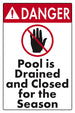 This Danger Pool is Drained and Closed for the Season Sign measures 12 x 18 inches, is printed on .040 mil Styrene Plastic, and is designed to inform patrons the pool is closed for the season. Our Danger signs indicate an imminently hazardous situation. This sign is lightweight, durable, and waterproof for indoor or outdoor use.This swimming pool and facility pool sign is designed for harsh swimming pool and outdoor environments. It includes a brass grommet in each corner for easy hanging or mounting. This sign is printed using our high-quality weather and sun resistant inks.