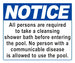 This Notice Shower Required Sign measures 12 x 10 inches, is printed on .040 mil Styrene Plastic, and is designed for preventing patrons from entering the pool area without showering first. It is a safety code requirement to shower prior to entering a public pool or spa. Our Notice signs indicate a statement of company policy as it relates to safety of personnel or property. This sign is lightweight, durable, and waterproof for indoor or outdoor use.All of our swimming pool, residential and facility signs are of the highest quality and predrilled for easy hanging. This sign is printed using our high-quality weather and sun resistant inks.