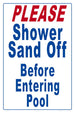 This Please Shower Sand Off Before Entering Pool Sign measures 12 x 18 inches, is printed on .040 mil Styrene Plastic and is designed to prevent patrons from entering the pool without showering sand off first. Our general information signs are very noticeable and used to inform people of facility restrictions, policy, object location or instruction. This sign is lightweight, durable, and waterproof for indoor or outdoor use.This swimming pool and facility pool sign is designed for harsh swimming pool and outdoor environments. It includes a brass grommet in each corner for easy hanging or mounting. This sign is printed using our high-quality weather and sun resistant inks.