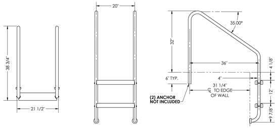 This high quality pool ladder has 2 steps for swimmers to get in and out of your pool. The distance between the front (pool) rail and back (anchor) rail is 36 inches and the overall outside diameter of the rail tubing is 1.50 inches.Spectrum Aquatics' ladders are passivated in an environmentally-friendly citric acid solution that provides a uniform and highly corrosion-resistant finish that is further protected by SpectraShield. The 20 inch wide HDPE tread incorporates molded nut inserts, eliminatng the need for exterior nts and sharp surfaces and is equipped with a step reference locator.