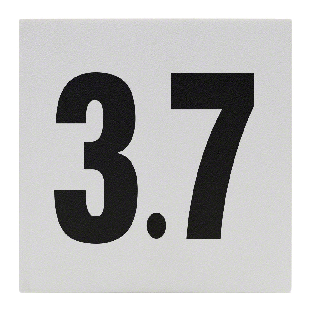 This ceramic pool depth marker is printed with 3.7 and has a skid resistant surface. It's overall size is 6 Inch x 6 Inch and has a letter height of 4 InchesThis ceramic pool tile is printed with ceramic glaze inks, then kiln fired to ensure the finest, most durable depth and safety marker line available. The skid resistant tile is surfaced in the factory, not sanded or coated, for a more reliable slip resistant surface! Skid resistant tiles are for deck or gutter applications.