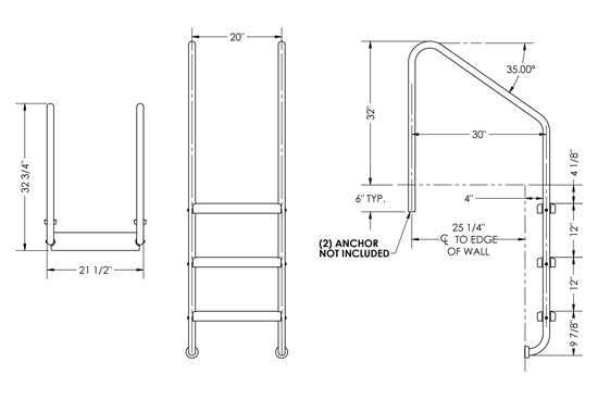 This high quality pool ladder has 3 steps for swimmers to get in and out of your pool. The distance between the front (pool) rail and back (anchor) rail is 30 inches and the overall outside diameter of the rail tubing is 1.50 inches.Spectrum Aquatics' ladders are passivated in an environmentally-friendly citric acid solution that provides a uniform and highly corrosion-resistant finish that is further protected by SpectraShield. The 20 inch wide HDPE tread incorporates molded nut inserts, eliminatng the need for exterior nts and sharp surfaces and is equipped with a step reference locator.