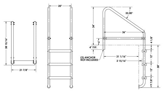 This high quality pool ladder has 3 steps for swimmers to get in and out of your pool. The distance between the front (pool) rail and back (anchor) rail is 36 inches and the overall outside diameter of the rail tubing is 1.90 inches.Spectrum Aquatics' ladders are passivated in an environmentally-friendly citric acid solution that provides a uniform and highly corrosion-resistant finish that is further protected by SpectraShield. The 20 inch wide HDPE tread incorporates molded nut inserts, eliminatng the need for exterior nts and sharp surfaces and is equipped with a step reference locator.