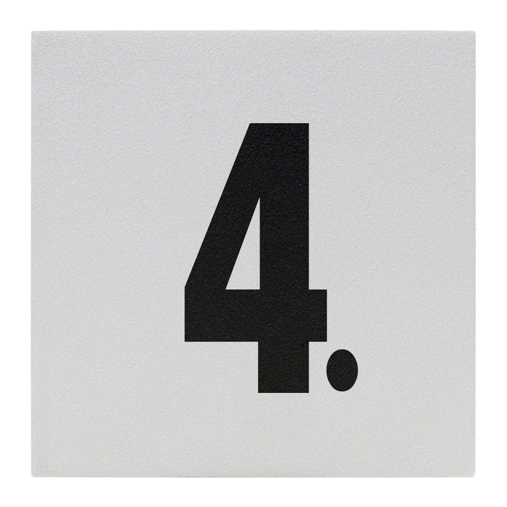 This ceramic pool depth marker is printed with 4 and has a skid resistant surface. It's overall size is 6 Inch x 6 Inch and has a letter height of 4 InchesThis ceramic pool tile is printed with ceramic glaze inks, then kiln fired to ensure the finest, most durable depth and safety marker line available. The skid resistant tile is surfaced in the factory, not sanded or coated, for a more reliable slip resistant surface! Skid resistant tiles are for deck or gutter applications.