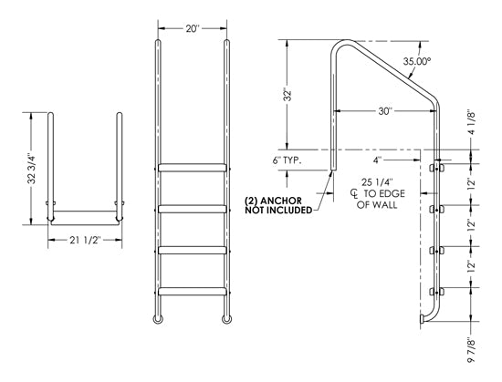 This high quality pool ladder has 4 steps for swimmers to get in and out of your pool. The distance between the front (pool) rail and back (anchor) rail is 30 inches and the overall outside diameter of the rail tubing is 1.50 inches.Spectrum Aquatics' ladders are passivated in an environmentally-friendly citric acid solution that provides a uniform and highly corrosion-resistant finish that is further protected by SpectraShield. The 20 inch wide HDPE tread incorporates molded nut inserts, eliminatng the need for exterior nts and sharp surfaces and is equipped with a step reference locator.