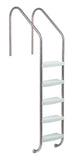 This high quality pool ladder has 5 steps for swimmers to get in and out of your pool. The distance between the front (pool) rail and back (anchor) rail is 36 inches and the overall outside diameter of the rail tubing is 1.90 inches.Recommended for heavy-duty commercial use at public and instituional pools. Each ladder comes standard with two frames and injection molded ABS-UV inhibited steps bolted between them. Made with corrosion resistant T304 stainless steel.