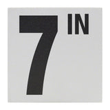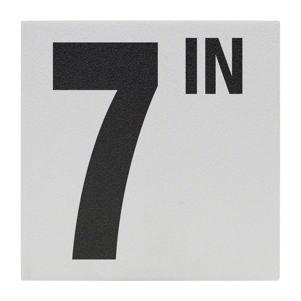 This ceramic pool depth marker is printed with 7 IN and has a skid resistant surface. It's overall size is 6 Inch x 6 Inch and has a letter height of 5 InchesThis ceramic pool tile is printed with ceramic glaze inks, then kiln fired to ensure the finest, most durable depth and safety marker line available. The skid resistant tile is surfaced in the factory, not sanded or coated, for a more reliable slip resistant surface! Skid resistant tiles are for deck or gutter applications.