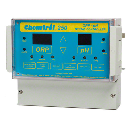 The Chemtrol 250 ORP/pH Digital Controller is a microprocessor-based digital controller designed to maintain both sanitizer ORP (oxidation-reduction potential or Redox) and water pH. The Chemtrol 250 features adjustable set-points, adjustable alarms,out-of-range alarms, and other features not normally found on these types of controllers. This controller is designed for affordability, simplicity of installation, ease of use, and long-term reliability. The CH250 unit includes the controller, respective probes (pH probe and ORP probe), paddle wheel flow switch, and miscellaneous plumbing supplies. It is the perfect controller for small commercial facilities like apartments, condos, and motels, as well as high-end residential pools.The Chemtrol 250 is easy to install and simple to use. All controls are on the front panel. A bright LCD display shows ORP and/or pH readings, calibration adjustments, and alarm limits. The five LED lights indicate the operating modes (OFF, Manual or Auto), feed status, out-of-range alarms, and overfeed alarms. The front panel controls include set-point, calibration, low and high alarm limits, safety timer limit, and proportional feed adjustment. Feed control is either ON/OFF or Proportional. The Proportional Feed feature is particularly useful to avoid overfeeding in small bodies of water. It reduces the feed cycle time progressively as the sensor reading approaches the set-point.