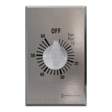 This is a Commercial Spring Wound Countdown Timer with a 60 minute maximum, SPST, 125-277 volts, in silver. The FF Series Commercial Countdown Timers are designed to replace any standard wall switch (single or multi-gang) and do not require energy to operate. These energy efficient switches automatically limit the ON times for fans, lighting, motors, heaters, and other energy consuming loads. A commercial brushed metal look plate (plastic construction) meets NEC requirements.Measurements: 4.125 x 1.75 x 1.25 inches.