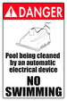 This Danger Pool Being Cleaned By Automatic Electrical Device Sign measures 12 x 18 inches, is printed on .040 mil Styrene Plastic, and is designed to prevent swimming while the pool is being cleaned. Our danger signs indicate an immediately hazardous situation. This is a lightweight, durable, and waterproof for indoor or outdoor use.This swimming pool and facility pool sign is designed for harsh swimming pool and outdoor environments. It includes a brass grommet in each corner for easy hanging or mounting. This sign is printed using our high-quality weather and sun resistant inks.