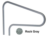 This powder coated deck mounted pool stair rail has a wall thickness of .049 inches, is corrosion resistant and provides a necessary hand grip for pool entry steps. Powder coated rock gray, this single 3-bend rail has an overall outside diameter of 1.90 inches for the rail tubing and the distance between the front (pool) rail and back (anchor) rail is 51 inches.For added durability as well as a decorative finish, powder-coating is an excellent upgrade for rails and ladders. The corrosion resistant surface gives S.R. Smith's high quality stainless steel additional protection as well as color.