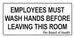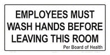 This Employees Must Wash Hands Before Leaving This Room Sign measures 12 x 06 inches, is printed on .040 mil Styrene Plastic and is designed to prevent employees from going back to work without washing their hands. Our general information signs are very noticeable and used to inform people of facility restrictions, policy, object location or instruction. This sign is lightweight, durable, and waterproof for indoor or outdoor use.