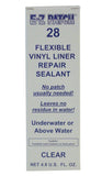 This is a 4.8 ounce tube of E-Z Patch 28, a Clear Vinyl Liner Repair Sealant, requiring no patch. When the sealant is used by itself, it forms a clear, strong patch all by itself. Just use your wet hand as your installation tool. E-Z Patch 28 may be applied under water or above water. It repairs cuts, rips and pinholes.This clear sealant does not burn your eyes or stick to your hand when applied under water, nor does it leave residue in the water. It is quick and easy to use with a full five minute working time. If a patch is needed due to heavy water flow, E-Z Patch 28 Clear Vinyl Liner Repair Sealant is also an excellent patch glue that is easy to handle and doesn't rush the repair by offering repair time of 5-10 minutes. A complete cure takes 3 to 5 days (must wait for complete cure before running pool vacuum).