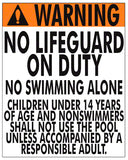 This Indiana Warning No Lifeguard On Duty (14 Years And Under) Sign measures 24 x 30 inches, is printed on .040 mil Styrene Plastic, and is designed to warn patrons that children under age 14 must be supervised and solo swimming is not allowed. The lettering is 4 inch and 2 inch. Our Warning signs indicate a potentially hazardous situation which, if not avoided, could result in death or serious injury. This sign is lightweight, durable and weatherproof for indoor or outdoor use.This swimming pool and facility pool sign is designed for harsh swimming pool and outdoor environments. It includes a brass grommet in each corner for easy hanging or mounting. This sign is printed using our high-quality weather and sun resistant inks.