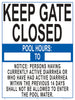 The combination Keep Gate Closed and Diarrhea sign is a requirement of the state of California and meets all lettering height requirements. It combines the two required notifications and includes pool hours so the sign can be conveniently posted at the entrance of the pool.