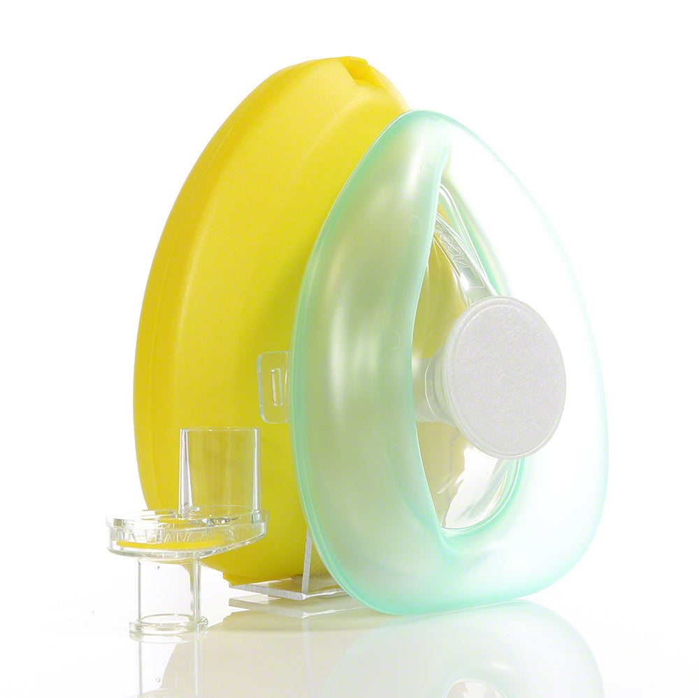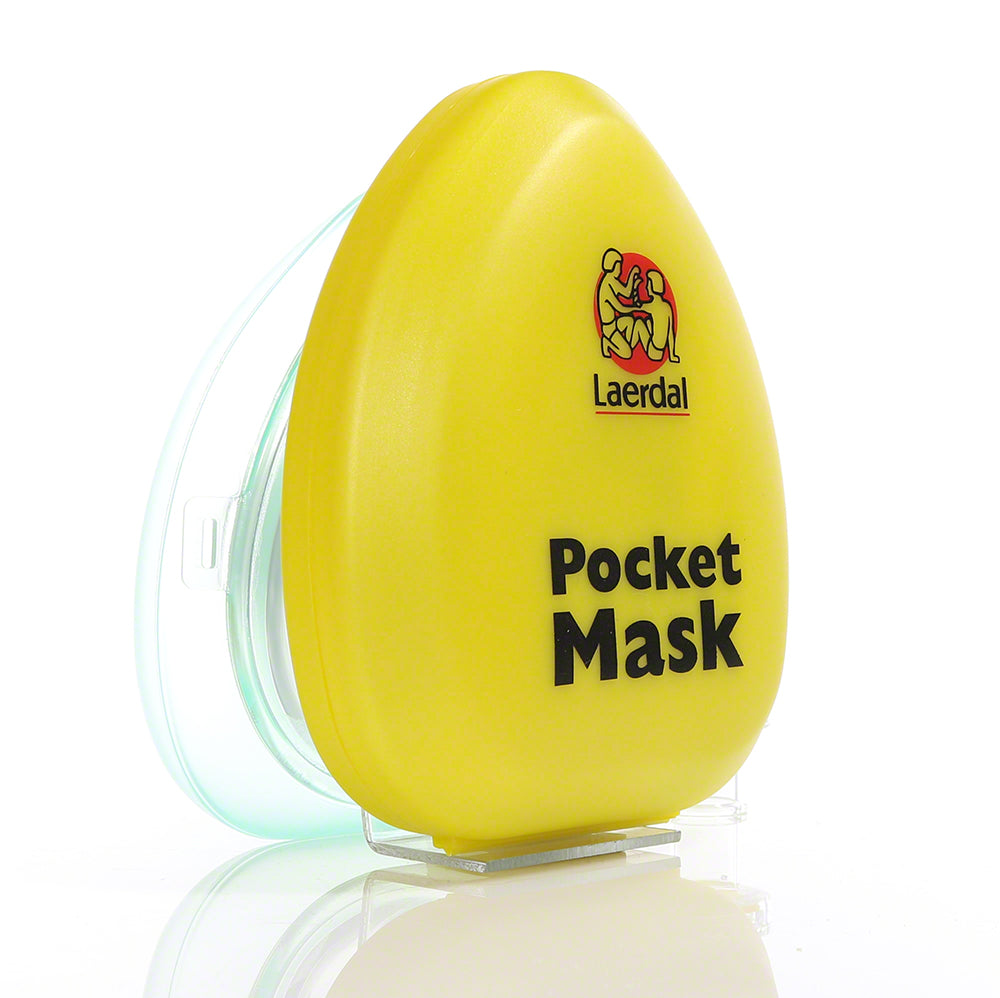 This is a Laerdal Pocket Mask, in a yellow case, designed to be used by the professional rescuer, lifeguard, or first responder. It offers superior protection for both the rescuer and the victim. The mask combines a low-resistance one-way valve with a disposable hydrophobic filter to help prevent the passage of liquids and secretions. The distance to the patient allows the rescuer to check patient's mouth color, secretions, and chest movement.