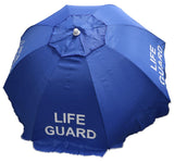 Our Pre-Printed Lifeguard Imprinted Umbrella in blue is made of durable weather-resistant nylon polyester. These 8-rib umbrellas are water resistant and easy to maintain. When opened, the diameter of the umbrella spans 6-1/2 feet.Comes with a two-piece 7-1/2 foot aluminum pole that has push button tilting device to allow the user to position the umbrella in a manner to protect the user from the sun.