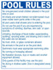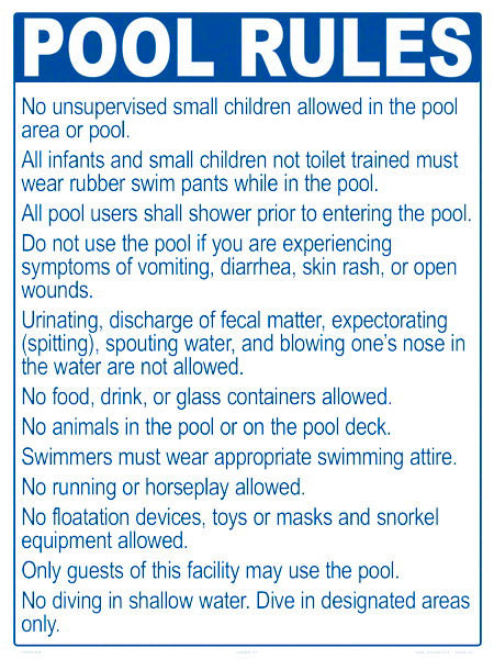 Pool rules signs help ensure the safety of those using and enjoying the pool by establishing clear expectations and guidelines that must be followed. This is critical to prevent accidents, both minor and major. Pool rules signs list the most important rules for swimmers as defined by state, local or federal guidelines. These rules specify proper use of the pool including hygiene, hours of operation, diving rules among others. Most states require posting of pool rules signs at all commercial pools. These signs are essential to limiting liability for pool owners and lifeguards.
