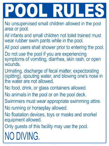 Pool rules signs help ensure the safety of those using and enjoying the pool by establishing clear expectations and guidelines that must be followed. This is critical to prevent accidents, both minor and major. Pool rules signs list the most important rules for swimmers as defined by state, local or federal guidelines. These rules specify proper use of the pool including hygiene, hours of operation, diving rules among others. Most states require posting of pool rules signs at all commercial pools. These signs are essential to limiting liability for pool owners and lifeguards.