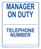 Manager on Duty with Telephone Number Write-on Sign - 10 x 12 Inches on Heavy-Duty Aluminum