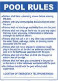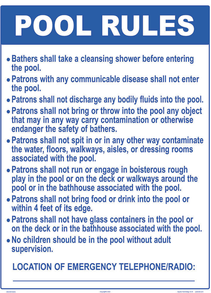 Pool rules signs help ensure the safety of those using and enjoying the pool by establishing clear expectations and guidelines that must be followed. This is critical to prevent accidents, both minor and major. Pool rules signs list the most important rules for swimmers as defined by state, local or federal guidelines. These rules specify proper use of the pool including hygiene, hours of operation, diving rules among others. Most states require posting of pool rules signs at all commercial pools. These signs are essential to limiting liability for pool owners and lifeguards.