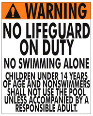This New Jersey Warning No Lifeguard On Duty (16 Years And Under) With Pool Hours Sign (Customize Or Leave Blank) measures 36 x 48 inches, is printed on 3.175 mil Heavy-Duty Dibond Aluminum, and is designed to warn patrons to not allow children under age 16 to use the pool or spa unattended and provides pool hours of operation. The lettering is 5.5 inch and 2 inch and meets New Jersey state code. Our Warning signs indicate a potentially hazardous situation which, if not avoided, could result in death or serious injury. This sign is lightweight, durable and weatherproof for indoor or outdoor use.Custom Text Sign. Leave sign blank or have us custom print hours at no extra charge. Enter the information you would like printed including the words Leave Blank, if that is what you desire.