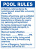 Pool rules signs help ensure the safety of those using and enjoying the pool by establishing clear expectations and guidelines that must be followed. This is critical to prevent accidents, both minor and major. Pool rules signs list the most important rules for swimmers as defined by state, local or federal guidelines. These rules specify proper use of the pool including hygiene, hours of operation, diving rules among others. Most states require posting of pool rules signs at all commercial pools. These signs are essential to limiting liability for pool owners and lifeguards.