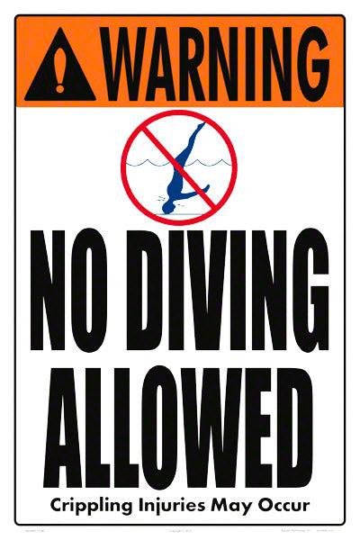This Warning No Diving Allowed With Graphic Sign is in 4 Inch Lettering, measures 12 x 18 inches, is printed on .040 mil Styrene Plastic, and is designed to prevent patrons from diving into the water. Our Warning signs indicate a potentially hazardous situation which, if not avoided, could result in death or serious injury. This sign is lightweight, durable and weatherproof for indoor or outdoor use.>This swimming pool and facility pool sign is designed for harsh swimming pool and outdoor environments. It includes a brass grommet in each corner for easy hanging or mounting. This sign is printed using our high-quality weather and sun resistant inks.