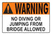 This is a Warning No Diving or Jumping from Bridge sign. Perfect for public swim areas or recreational areas with bridges, this sign will help prevent injuries.