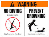 This Warning No Diving Prevent Downing With Graphic Sign is a 2-part sign that measures 24 x 18 inches, is printed on heavy-duty aluminum material, and is designed to prevent patrons from diving into the water or drowning. Our Warning signs indicate a potentially hazardous situation which, if not avoided, could result in death or serious injury. This sign is lightweight, durable and weatherproof for indoor or outdoor use.