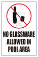 This No Glassware Allowed In Pool Area With Graphic Sign measures 12 x 18 inches, is printed on .040 mil Styrene Plastic and is designed to prevent patrons from bringing glassware into the pool area. Our general information signs are very noticeable and used to inform people of facility restrictions, policy, object location or instruction. This sign is lightweight, durable, and waterproof for indoor or outdoor use.This swimming pool and facility pool sign is designed for harsh swimming pool and outdoor environments. It includes a brass grommet in each corner for easy hanging or mounting. This sign is printed using our high-quality weather and sun resistant inks.