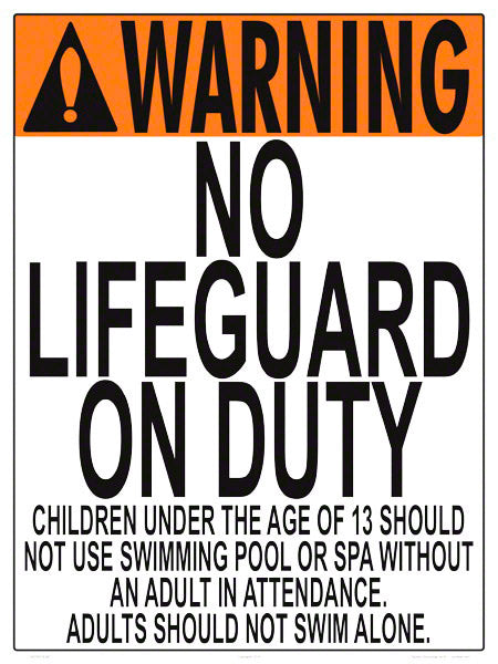This Warning No Lifeguard On Duty (13 Years And Under) aluminum sign measures 18 x 24 inches, is printed on heavy-duty aluminum material, and is designed to warn patrons to not allow children under age 13 to use the pool or spa unattended where there is no lifeguard on duty. The lettering is 4 inch and 1 inch. Our Warning signs indicate a potentially hazardous situation which, if not avoided, could result in death or serious injury. This sign is lightweight, durable and weatherproof for indoor or outdoor use.All our pool signs are professional quality and predrilled for easy hanging. This sign is printed using our high-quality weather resistant-sun resistant inks.