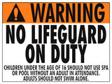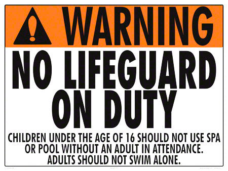 This Warning No Lifeguard On Duty (16 Years And Under) aluminum sign measures 24 x 18 inches, is printed on heavy-duty aluminum material, and is designed to warn patrons that children under age 16 must be supervised and adults should not swim alone. The lettering is 4 inch and 1 inch. Our Warning signs indicate a potentially hazardous situation which, if not avoided, could result in death or serious injury. This sign is lightweight, durable and weatherproof for indoor or outdoor use.This swimming pool and facility pool sign is designed for harsh swimming pool and outdoor environments. It is predrilled in each corner for easy hanging or mounting. This sign is printed using our high-quality weather and sun resistant inks.