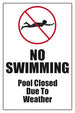 This No Swimming Pool Closed Due to Weather With Graphic aluminum sign measures 12 x 18 inches, is printed on heavy-duty aluminum material and is designed to inform patrons that the pool is closed due to weather. Our general information signs are very noticeable and used to inform people of facility restrictions, policy, object location or instruction. This sign is lightweight, durable, and waterproof for indoor or outdoor use.This swimming pool and facility pool sign is designed for harsh swimming pool and outdoor environments. It is predrilled in each corner for easy hanging or mounting. This sign is printed using our high-quality weather and sun resistant inks.