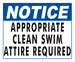 Management may have their own rules to post for their aquatic facility. Some of these policy rules may even be required by your state. This Notice Appropriate Clean Swim Attire Required notifies patrons that clothing, cut-offs, etc., cannot be used for sanitary reasons.