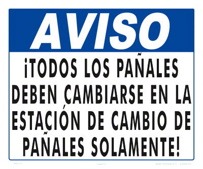 This Notice All Diapers Must Be Changed At The Diaper Changing Station Only Sign, in Spanish, measures 12 x 10 inches, is printed on .040 mil Styrene Plastic, and is designed for preventing patrons from changing diapers outside of changing stations. Our Notice signs indicate a statement of company policy as it relates to safety of personnel or property. This sign is lightweight, durable, and waterproof for indoor or outdoor use.All of our swimming pool, residential and facility signs are of the highest quality and predrilled for easy hanging. This sign is printed using our high-quality weather and sun resistant inks.