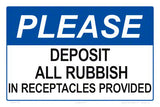 Notice Deposit All Rubbish Sign - 12 x 8 Inches on Styrene Plastic