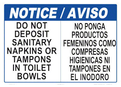 This Notice Do Not Deposit Sanitary Napkins or Tampons in Toilet Bowls sign is in both English and Spanish, measures 14 x 10 inches, is printed on .040 mil Styrene Plastic, and is designed to prevent flushing feminine products down toilets. Our general information signs are very noticeable and used to inform people of facility restrictions, policy, object location or instruction. This sign is lightweight, durable, and waterproof for indoor or outdoor use.