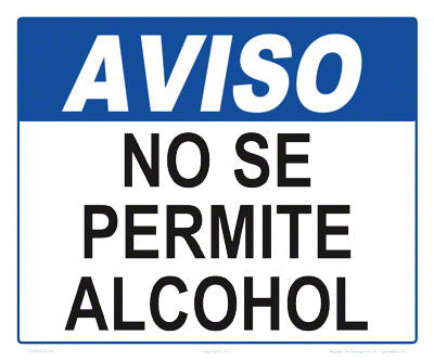 This Notice No Alcohol Allowed Sign, in Spanish, measures 12 x 10 inches, is printed on .040 mil Styrene Plastic, and is designed for preventing patrons from bringing alcohol beyond designated areas. Our Notice signs indicate a statement of company policy as it relates to safety of personnel or property. This sign is lightweight, durable, and waterproof for indoor or outdoor use.All of our swimming pool, residential and facility signs are of the highest quality and predrilled for easy hanging. This sign is printed using our high-quality weather and sun resistant inks.