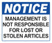 Notice Not Responsible for Lost Articles Sign - 12 x 10 Inches on Heavy-Duty Aluminum