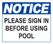This Notice Please Sign In Before Using Pool Sign measures 12 x 10 inches, is printed on .040 mil Styrene Plastic, and is designed for informing patrons that signing in is required before using the pool. Our Notice signs indicate a statement of company policy as it relates to safety of personnel or property. This sign is lightweight, durable, and waterproof for indoor or outdoor use.All of our swimming pool, residential and facility signs are of the highest quality and predrilled for easy hanging. This sign is printed using our high-quality weather and sun resistant inks.