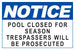 This Notice Pool Closed for Season Trespassers Will Be Prosecuted aluminum sign measures 18 x 12 inches, is printed on heavy-duty aluminum material, and is designed for preventing patrons from trespassing when the pool is closed. Our Notice signs indicate a statement of company policy as it relates to safety of personnel or property. This sign is lightweight, durable, and waterproof for indoor or outdoor use.This swimming pool and facility pool sign is designed for harsh swimming pool and outdoor environments. It is predrilled in each corner for easy hanging or mounting. This sign is printed using our high-quality weather and sun resistant inks.