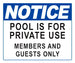Management may have their own rules to post for their aquatic facility. Some of these policy rules may even be required by your state. This Notice Pool is for Private Use sign notifies individuals this pool is restricted to members and guests only.
