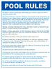 Pool rules signs help ensure the safety of those using and enjoying the pool by establishing clear expectations and guidelines that must be followed. This is critical to prevent accidents, both minor and major. Pool rules signs list the most important rules for swimmers as defined by state, local or federal guidelines. These rules specify proper use of the pool including hygiene, hours of operation, diving rules among others. Most states require posting of pool rules signs at all commercial pools. These signs are essential to limiting liability for pool owners and lifeguards.