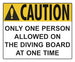 Safety Notification signs are used at aquatic facilities to notify patrons of extra precautions that should be taken or other information related to safety concerns. This One Person on Board Caution sign indicates there only should be one person on the diving board.