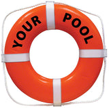 This orange 24 inch U.S.C.G. ring buoy can be personalized with the name of your facility, swimming pool, boat, etc., in black vinyl.Our life ring buoys are manufactured under strict codes and the supervision of the United States Coast Guard. They have solid, closed-cell plastic throughout. Soft and resilient to the touch yet are almost indestructible! The Soft-Tex surface resists weather and temperature extremes and will not rot or mildew.